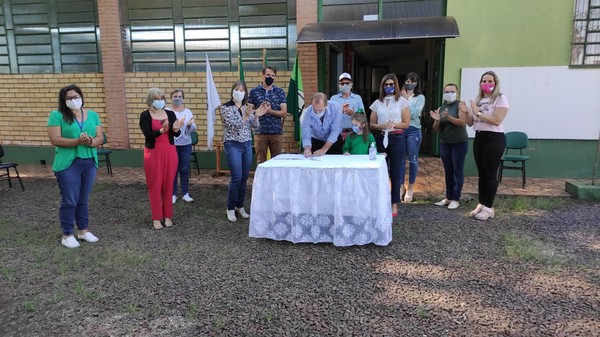 O chefe do Executivo esteve na Escola Estadual de Ensino Fundamental General Osório, do distrito de São Pedro, na manhã desta sexta-feira, 12 de março. Para evitar aglomerações, em função dos protocolos sanitários, o evento limitou a participação de apenas um representante de cada segmento da comunidade escolar. A presença de Rosemar Sala celebrou a municipalização do educandário, que a partir de agora será mantido pelo município.
