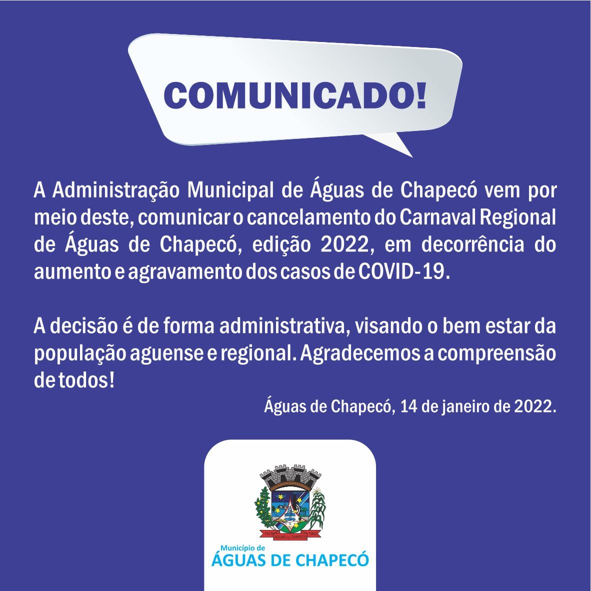 Em um comunicado publicado nesta sexta-feira (14), a prefeitura de Águas de Chapecó anunciou que cancelou a programação do carnaval prevista para 2022. Na nota o prefeito Leonir Antônio Hentges (PL) destaca a circulação de variante Ômicron, da covid-19.