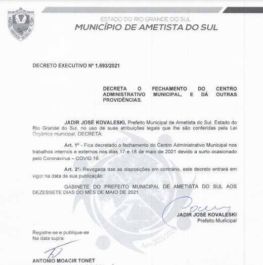 A Prefeitura de Ametista do Sul informou, na tarde desta segunda-feira (17), que a sede ficará fechada até terça-feira (18) para desinfecção do local após um surto de Covid-19 entre os servidores.