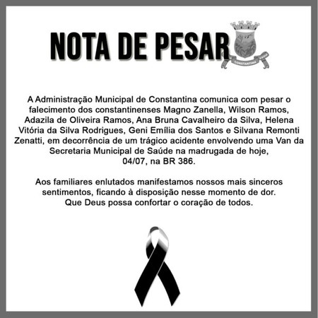A Prefeitura Municipal de Constantina publicou uma nota de pesar em nome das sete vitimas que morreram, após acidente de trânsito no início da manhã desta segunda-feira (04), na BR 386 KM 111. Todos os passageiros eram pacientes que buscavam atendimento de saúde em outros municípios da região.