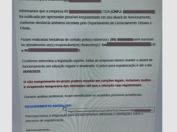 Os criminosos usam o nome de secretarias da prefeitura para alegar que as empresas estão com pendências e passíveis de sofrer sanções legais. Para contornar o problema, o cidadão é direcionado a clicar em um link suspeito.
