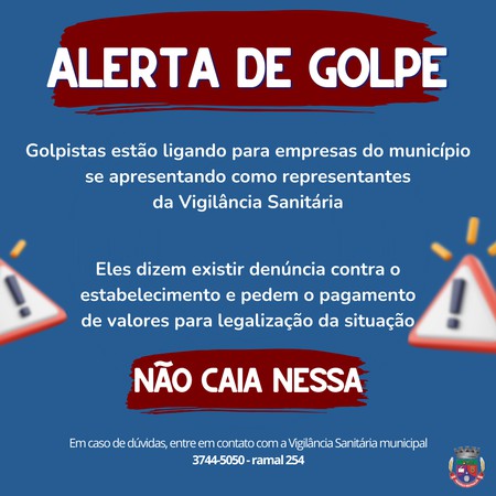 A orientação da Vigilância Sanitária municipal é não repassar os valores e registrar boletim de ocorrência na Polícia Civil. Em caso de dúvidas, a equipe está à disposição dos empresários para esclarecimentos, pelo telefone 3744-5050, no ramal 254.