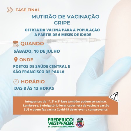 Neste sábado, 10 de julho, a Administração de Frederico Westphalen, através da Secretaria da Saúde, realiza o Mutirão de Vacinação contra a Gripe. A iniciativa acontece nos Postos Central e do bairro São Francisco de Paula. Serão imunizadas pessoas a partir de 6 meses.