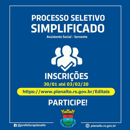 A administração de Planalto divulgou nesta quarta-feira, 29, dois editais para processo seletivo simplificado para o quadro de servidores do município. No total são 29 vagas a serem preenchidas.