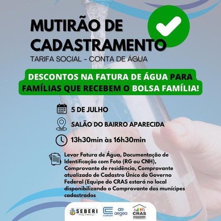 A Administração Municipal de Seberi firmou uma parceria com a Companhia Riograndense de Saneamento (Corsan Aegea) para o cadastramento de famílias seberienses que possuem o Cadastro Único (CadÚnico) e recebem o Bolsa Família, no programa Tarifa Social, que oferece descontos significativos na conta de água. A iniciativa busca aliviar o orçamento das famílias que mais necessitam.