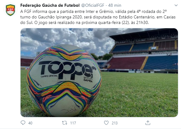 A Federação Gaúcha de Futebol anunciou que o Grenal válido pela 4ª rodada do 2º turno do Gauchão Ipiranga 2020, não será disputado no estádio Beira Rio em Porto Alegre.