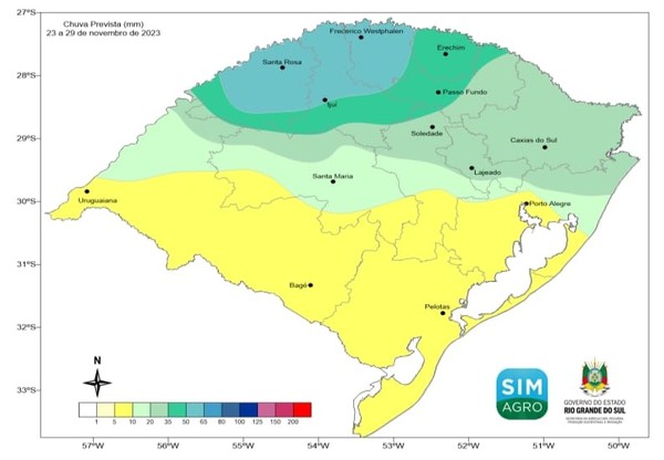 A projeção para a próxima semana novamente mostra chuva em todo o RS. No sábado (25), o tempo seco, com ligeira elevação da temperatura, predominará em todo o Estado. No domingo (26), o ingresso de ar quente e úmido favorecerá maior variação de nuvens, com possibilidade de pancadas isoladas de chuva nas Missões, Alto Uruguai e no Planalto. Na segunda (27) e terça-feira (28), a aproximação de uma nova área de baixa pressão deverá provocar pancadas de chuva e trovoadas em todo o Estado. Na quarta-feira (29), o ingresso de ar úmido e quente favorecerá a elevação das temperaturas, com valores superiores a 30 °C na maioria das regiões. Os totais previstos deverão ser inferiores a 10 mm na maior parte da Metade Sul. No restante do Estado, os volumes esperados deverão oscilar entre 20 e 35 mm e, somente nas Missões e Alto Uruguai, os valores poderão alcançar 60 mm em diversas localidades.