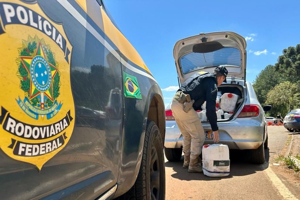 Dentro do carro, os PRFs encontraram 35 galões carregados com agrotóxico contrabandeado. O produto é proibido no Brasil e causa riscos à saúde humana e ao meio ambiente.