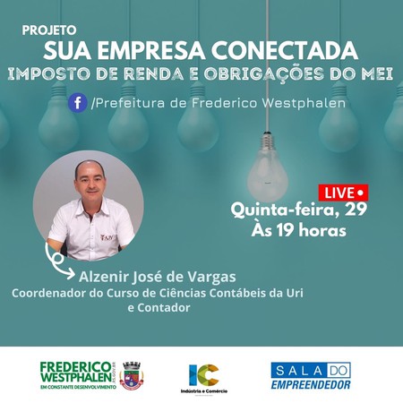 A Administração Municipal de Frederico Westphalen, através da Secretaria de Indústria, Comércio e Turismo e Sala do Empreendedor apresenta, nesta quinta-feira, 29 de abril, nova Live do projeto Sua empresa conectada.
