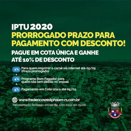 A Administração Municipal de Frederico Westphalen prorrogou o prazo para desconto de até 10% no pagamento em cota única do Imposto Predial e Territorial Urbano (IPTU). Devido a instabilidades no sistema gerador das guias do tributo, verificadas na quarta-feira, 15, o prazo limite para garantir o desconto máximo foi prorrogado para o dia 5 de maio. A decisão foi tomada nesta quarta-feira, 15 de abril, e consolidada por decreto assinado pelo prefeito.