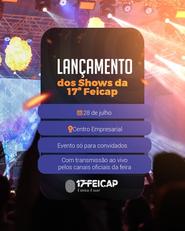 O evento de lançamento dos shows será destinado a convidados, em 28 de julho, no Auditório do Centro Empresarial, a partir das 20 horas, com transmissão ao vivo ao público em geral pelos canais oficiais da feira.