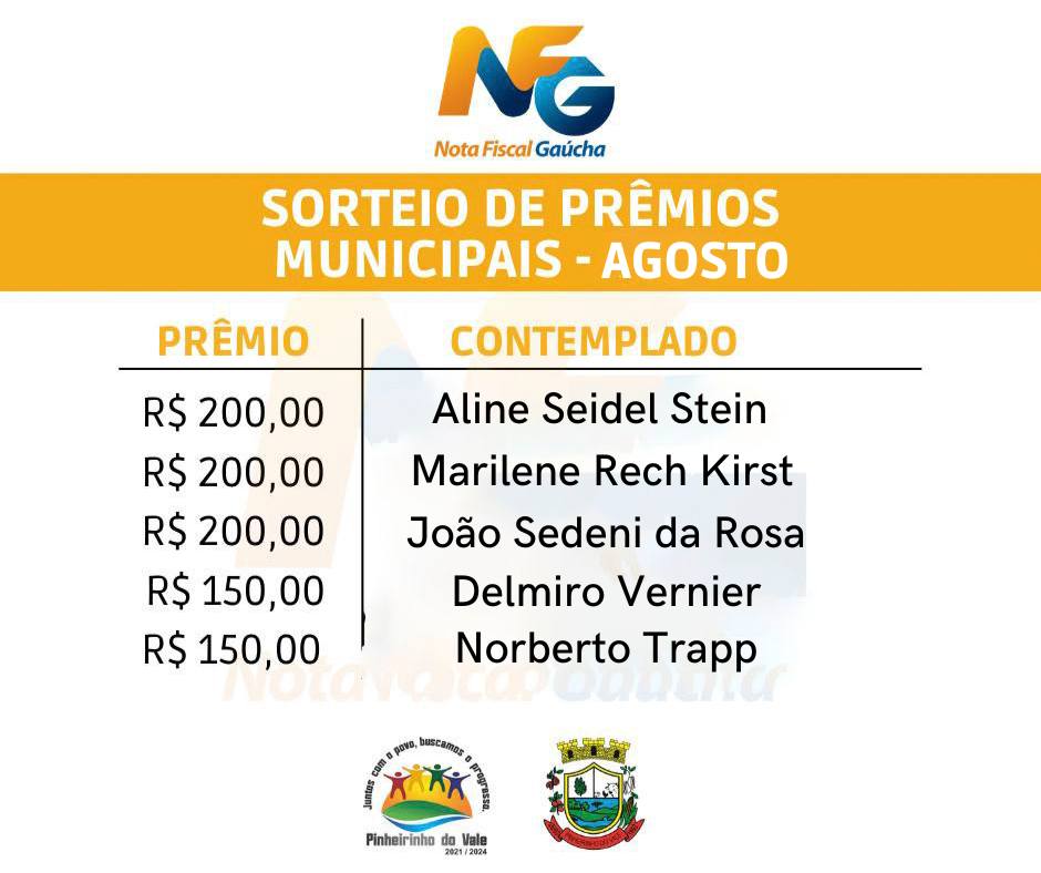 Na quinta-feira, 1 de setembro, foi realizado no município de Pinheirinho do Vale, o sorteio mensal referente ao mês de Agosto/2022 através da plataforma do Nota Fiscal Gaúcha. Foram três prêmios de R$ 200,00 e dois prêmios de R$150,00.