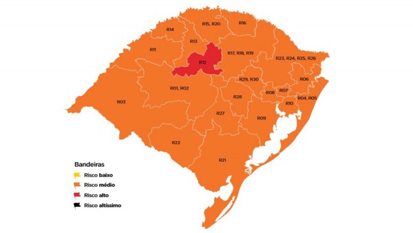 Dessa forma, o mapa do RS volta a ter bandeira vermelha depois de duas semanas consecutivas e nenhuma amarela – que havia também duas rodadas atrás. As bandeiras amarelas (risco epidemiológico baixo) nas regiões de Bagé, Cachoeira do Sul e Palmeira das Missões deram lugar, novamente, a bandeiras laranjas (risco médio).
