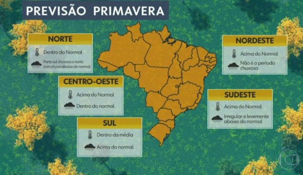 No Nordeste, as temperaturas durante a primavera ficarão acima da média, mas em menor quantidade que em outras regiões do país. A Primavera é a estação mais seca do leste da região. O calor será forte no Maranhão, Piauí e Bahia.