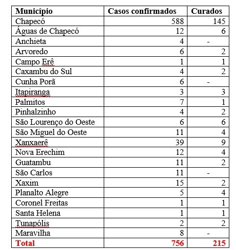 Em SC, o município que registra o maio número de casos é Chapecó, com 588 pacientes acometidos pela doença. O município tem 145 pessoas curadas e dois óbitos.