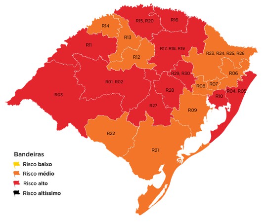 Rio Grande do Sul permanece com 11 regiões em bandeira vermelha