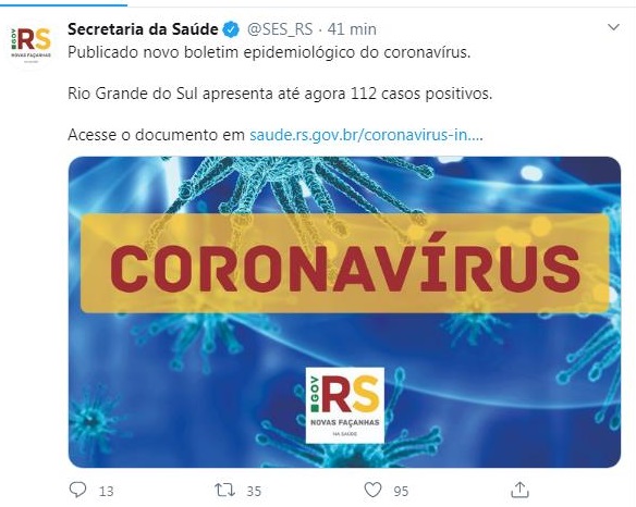 Rio Grande do Sul registra 112 casos de coronavírus
