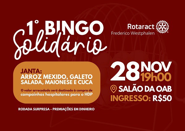 O Rotaract Club de Frederico Westphalen realiza, na sexta-feira, 28 de novembro, às 19 horas, no Salão da OAB, o 1º Bingo Solidário em apoio ao Hospital Divina Providência (HDP). O valor arrecadado será destinado à compra de campainhas hospitalares, item essencial para melhorar a comunicação entre pacientes e equipe assistencial.