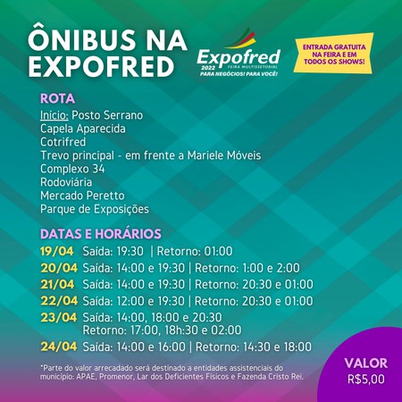 Para o público que deseja ter acesso ao Parque de Exposições Monsenhor Vitor Battistella de 19 a 24 de abril, a Comissão organizadora da Expofred divulga o roteiro e horários de saída. Desta forma, os visitantes terão mais uma opção de locomoção, além de táxis, aplicativos de mobilidade urbana e entrada com veículo próprio. O valor da passagem será de R$ 5,00.