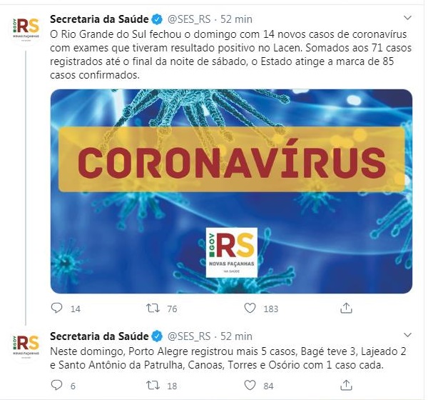 O Rio Grande do Sul terminou o domingo, 22 de março, com 14 novos casos de coronavírus em exames realizados no Laboratório Central de Saúde Pública do Rio Grande do Sul. Somados aos 71 registrados até o final da noite de sábado, 21 de março, o Estado agora tem 85 casos confirmados.