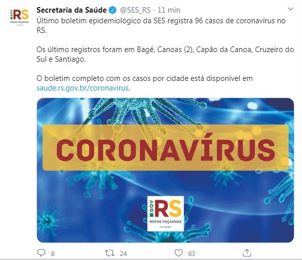 A Secretaria de Saúde do Estado divulgou no final da tarde desta segunda-feira, 23 de março, o informe epidemiológico da Covid-19, o Estado registrou 96 casos da doença, os último registros foram em Bagé, Canoas com dois casos, Capão da Canoa, Cruzeiro do Sul e Santiago. A Secretaria não divulgou, até o momento, informações sobre os perfis dos pacientes.