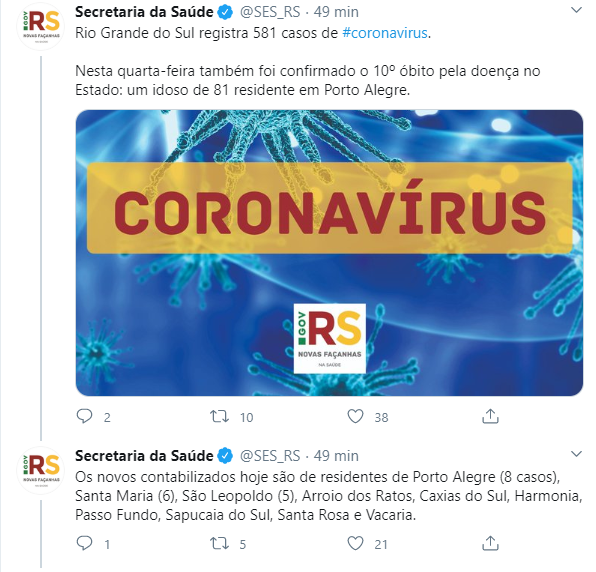 O Rio Grande do Sul registrou a décima morte por coronavírus, hoje, 8 de abril, segundo a Secretaria de Saúde do Estado, trata-se de um homem idoso de 81 anos que estava internado desde 20 de março, na UTI do Hospital de Clínicas em Porto Alegre e tinha histórico de comorbidade. Ele teve o início dos sintomas foi no dia 18 de março. O homem tem histórico de viagem ao exterior, ele retornou da Espanha com escala na Itália.