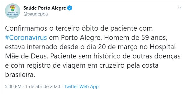 A Secretaria de Saúde de Porto Alegre confirmou a terceira morte no município, nesta quarta-feira, 1° de abril, por Coronavírus, somada aos óbitos em Ivoti e Novo Hamburgo essa é a quinta morte pela Covid-19 no Rio Grande do Sul.