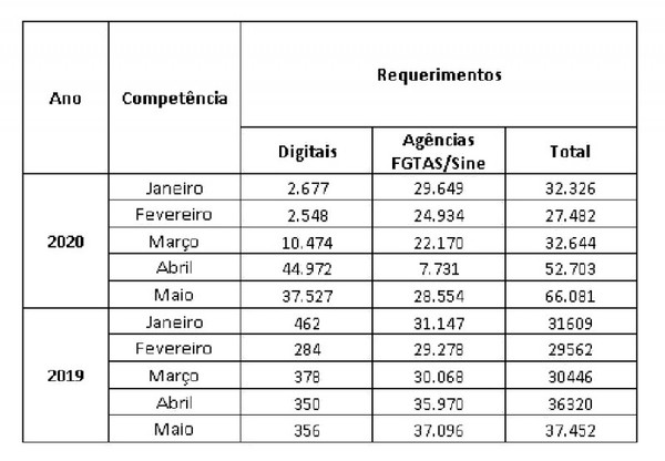 Do total de 66.820 solicitações do benefício, 37.527 foram recebidas pela internet e 29.293, presencialmente nos postos de atendimento, sendo 97,5% nas agências FGTAS/Sine. O número total de requerimentos representa aumento de 70,3% em comparação a maio de 2019 e de 25,9% em relação a abril de 2020.