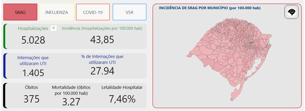 De acordo com dados do Centro Estadual de Vigilância em Saúde (Cevs), divulgados em painel, o Rio Grande do Sul registrou neste ano, até esta terça-feira, 27 de maio, 5.028 hospitalizações por Srag, causadas por infecções como influenza (gripe), covid-19 e vírus sincicial respiratório (VSR), entre outros. Do total de casos, 375 evoluíram para óbito. Entre as crianças menores de cinco anos, foram registradas 1.690 internações e 11 mortes e entre os idosos, onde a Srag é mais letal foram 2.109 casos com 293 óbitos.