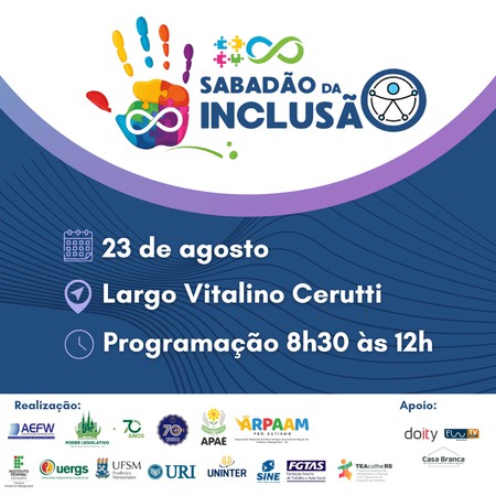 No próximo sábado, 23 de agosto, será realizado o Sabadão da Inclusão, uma edição especial do evento que acontece no Largo Vitalino Cerutti, no centro de Frederico Westphalen, como parte da 4ª Semana Municipal da Pessoa com Deficiência Intelectual e Múltipla.