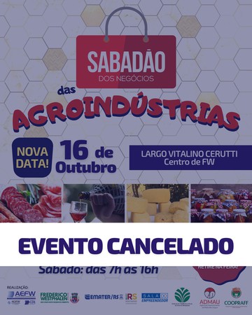 Por conta da previsão de chuva para este sábado, dia 16, os organizadores do Sabadão dos Negócios das Agroindústrias optaram por cancelar o evento. A programação contava com uma feira de produtos coloniais no Largo Vitalino Cerutti, no centro de FW, e será inviável manter a participação das mais de 25 agroindústrias e feirantes. Da mesma forma, o horário diferenciado para o comércio deste Sabadão Especial também foi cancelado.