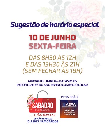 Para potencializar ainda mais as vendas na data, que é considerada uma das mais importantes do ano, o Núcleo de Desenvolvimento do Comércio da AEFW apresentou uma ideia de abertura do comércio na noite anterior ao Sabadão: sexta-feira, dia 10 de junho, estendendo o horário até às 21 horas, sem fechar às 18h. A ideia foi apresentada em reunião e aprovada pelos demais participantes do Núcleo, estratégia que pode se tornar tradicional em Sabadões especiais, como Páscoa, Dia das Mães, Dia dos Pais, Crianças, etc.
