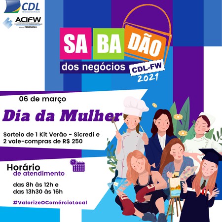 A próxima edição do Sabadão dos Negócios ocorrerá no dia 6 de março. A ação fará alusão ao Dia da Mulher e contará com o tradicional horário ampliando das 8h às 12h e das 13h30min às 16h. A campanha é uma realização da Associação Empresarial de Frederico Westphalen – ACI/CDL.