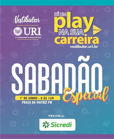 Neste sábado, dia 1º de Junho, a Universidade Regional Integrada do Alto Uruguai e das Missões – URI campus de Frederico Westphalen promove o Sabadão Especial da URI. Na Praça da Matriz, no centro de FW.