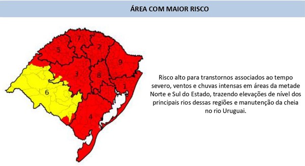 A Sala de Situação da Secretaria do Meio Ambiente do Rio Grande Sul (Sema/RS) emitiu na terça-feira, 31 de outubro, um alerta vermelho para a possibilidade de tempo severo, ventos e chuvas intensas e cheias em parte do território gaúcho. O risco é alto para tempestades isoladas com queda de granizo e rajadas fortes de vento, ou seja, condições para tempo severo na metade Norte e Sul gaúcho.