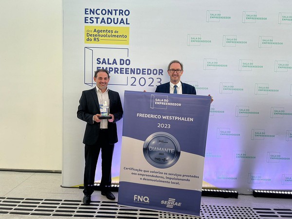 Em uma cerimônia realizada dia 12 de dezembro, na sede da Fecomércio RS, em Porto Alegre, a Sala do Empreendedor de Frederico Westphalen foi certificada pelo terceiro ano consecutivo com o Selo Diamante. Essa certificação reconhece e atesta a excelência nos serviços e qualidade no atendimento prestados pela Sala do Empreendedor, reforçando seu comprometimento contínuo com o apoio aos empreendedores locais. O prefeito José Alberto Panosso e o secretário da Indústria, Comércio e Turismo, Alessandro Molossi, representaram o município.