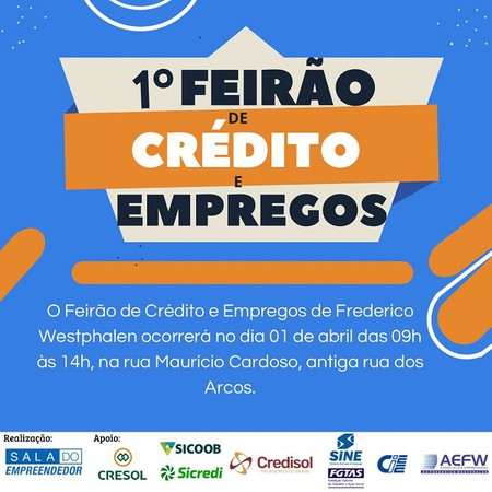 A Sala do Empreendedor em parceria com a Sicredi, Cresol, Sicoob e Credisol, as Agências de Emprego FGTAS/SINE, CIEE, com apoio da Associação Empresarial AEFW, irão promover o 1º Feirão de Crédito e Empregos de Frederico Westphalen, no próximo sábado, dia 1º de abril.