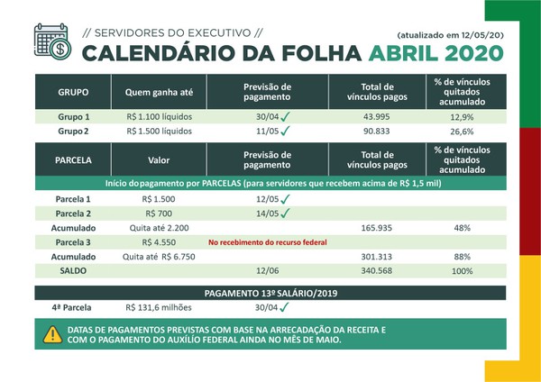 A próxima parcela será no valor de R$ 4.550, mas ainda não há data definida para o pagamento, pois depende do dia em que os recursos da União, referentes ao Programa Federativo de Enfrentamento ao Coronavírus, ingressarem no caixa do Estado.