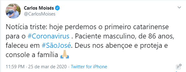 Santa Catarina confirmou a primeira morte por coronavírus, a informação foi confirmada pelo governador Carlos Moisés no Twitter, às 11h59 de quarta-feira, 26 de março. A morte foi na cidade de São José região metropolitana de Florianópolis, trata-se de um idoso de 86 anos.