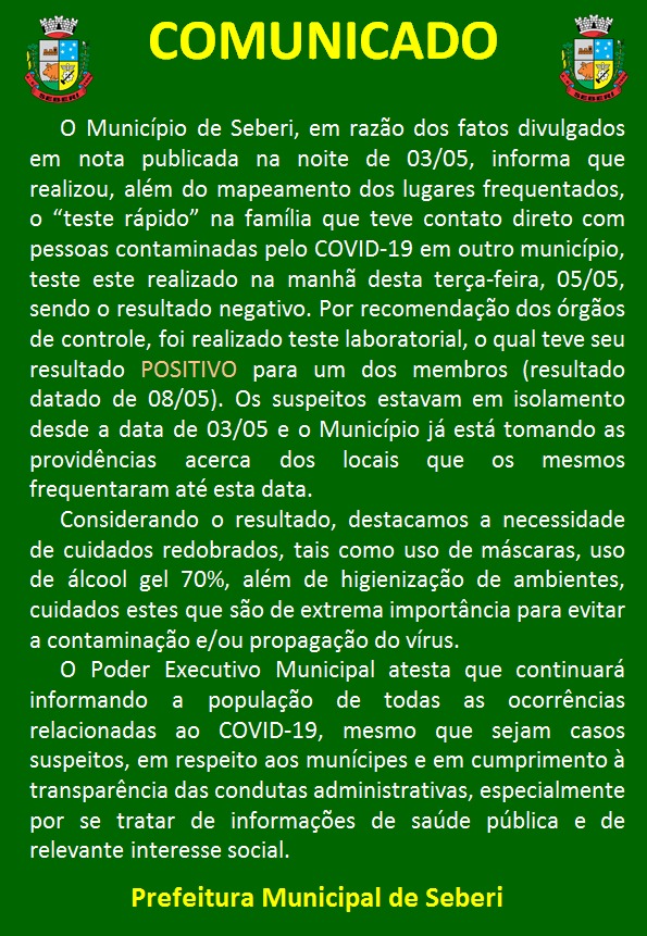 Em nota o município de Seberi confirmou o primeiro caso de Covid-19 no município. De acordo com as informações divulgadas se trata de um dos casos que teve contato com familiares que acabaram testando positivo no município de Teutônia.