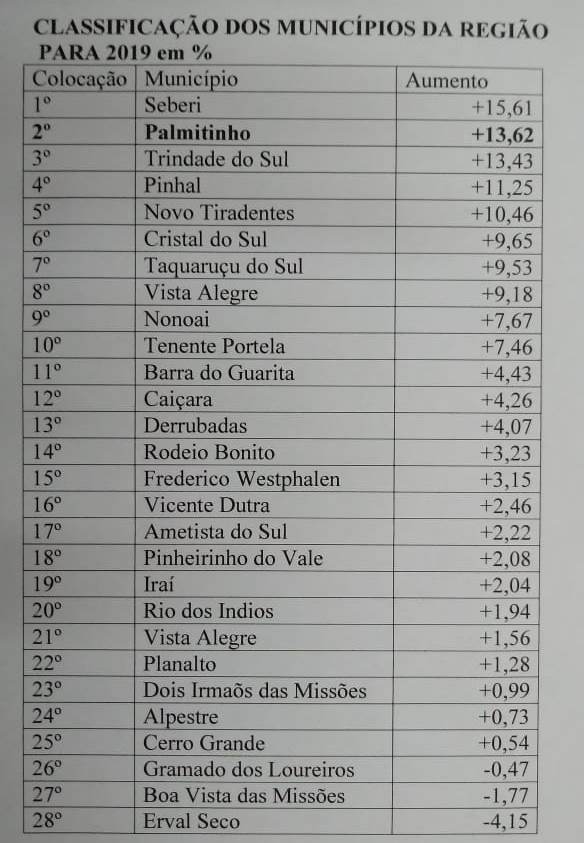 Na região, Seberi e Palmitinho estão entre os dez municípios do Estado que tiveram maior alta no retorno do ICMS. Quem lidera no RS é Pinhal Grande (28,99%), seguido de Seberi (15,62%), Guaíba (15,52%), Severiano de Almeida (14,76%), Salto do Jacuí (14,13%), Pinto Bandeira (14,02%), Candiota (14,02%) e Itati (13,72%). Palmitinho (13,62%) está na nona colocação e Trindade do Sul (13,45%) fecha a lista dos dez com maior alta.