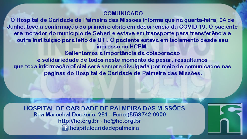 O município de Seberi registrou a primeira morte por coronavírus, trata-se de Flávio Prestes Loronha, que era empresário. A morte foi confirmada na manhã desta quinta-feira, 4 de junho.