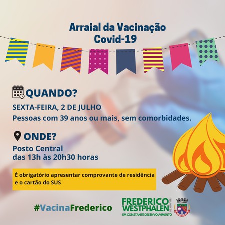 A Administração Municipal de Frederico Westphalen, através da Secretaria da Saúde, realiza nessa sexta-feira, 2 de julho, o Arraiá da Vacinação. A programação inicia às 13 horas, com imunização de pessoas com 39 anos ou mais, sem comorbidades, e segue até as 20h30, no Posto Central de Saúde. A partir das 17 horas haverá música e distribuição de pipoca e chocolate quente para o público-alvo.