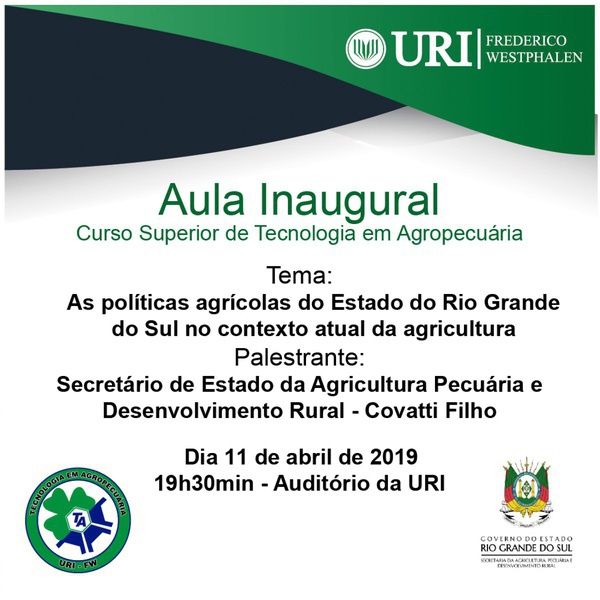 O Secretário de Agricultura, Pecuária e Desenvolvimento Rural do Estado do Rio Grande do Sul, Luis Antonio Covatti Filho será o palestrante da Aula Inaugural do Curso Superior de Tecnologia em Agropecuária da URI/FW.