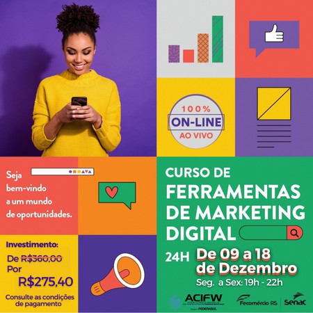O Serviço Nacional de Aprendizagem Comercial (Senac), em parceria com a Associação Comercial, Industrial e de Prestação de Serviços de Frederico Westphalen (ACIFW), promove o Curso de Ferramentas de Marketing Digital. A capacitação acontecerá durante 8 dias e tem como carga horária total 24 horas, com início em 09 de dezembro e término em 18 de dezembro, de segunda a sexta-feira, das 19 às 22 horas.