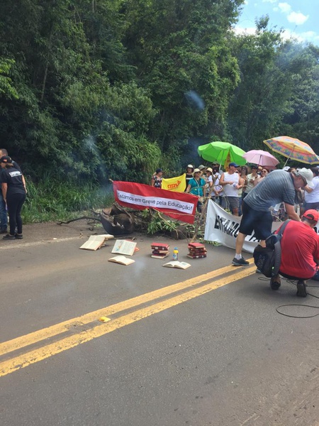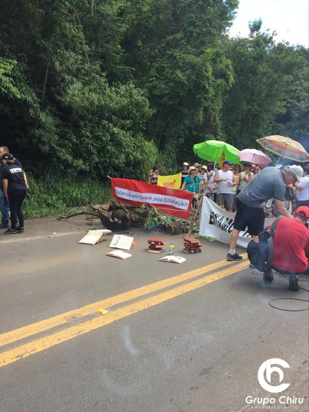 Membros do Cpers Sindicado, da reserva remunerada da Brigada Militar e dos Bombeiros, policiais civis, bem como familiares e a comunidade usam faixas, pedaços de madeira e livros para bloquear o trânsito no KM 1 da rodovia.