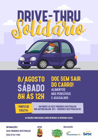 A unidade Sesc de Frederico Westphalen promove neste sábado, 8, o primeiro Drive-thru Solidário para arrecadação de alimentos que serão entregues as entidade cadastradas no Mesa Brasil. A campanha acontece neste mesmo dia em todo o Rio Grande do Sul.