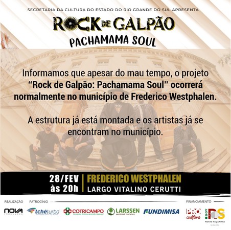A programação para celebrar os 67 anos de Frederico Westphalen segue mesmo com o mau tempo. A Administração do município divulgou, por meio da assessoria de comunicação, a realização do show desta noite com o grupo Rock de Galpão.