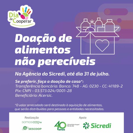 A arrecadação de alimentos será realizada até o dia 31 de julho e acontece em todos os municípios de abrangência do Sicredi. Cada agência possui um local específico para que o associado possa contribuir com a iniciativa e ao final da campanha, todos os mantimentos serão destinados a entidades assistenciais de seus respectivos municípios. Aqueles que tem preferência por contribuir com uma transferência bancária com os seguintes dados: Banco: 748 – Ag: 0230 – Cc: 41189-2, ou por meio do PIX, com a chave 03.573.024/0001-28, beneficiário: Acersic. Todo o valor arrecadado também será destinado à aquisição de alimentos.