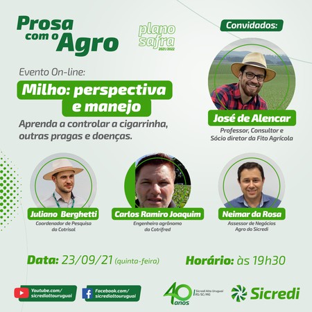 A Sicredi Alto Uruguai RS/SC/MG realizará mais uma edição do “Prosa com Agro” e, desta vez, vai trazer um tema que gerou grandes preocupações nos produtores de milho: a cigarrinha. Voltada para associados, parceiros e interessados no agronegócio, a programação digital será realizada no Facebook (www.facebook.com/sicredialtouruguai) e Youtube (www.youtube.com/sicredialtouruguai) no dia 23 de setembro, às 19h30.